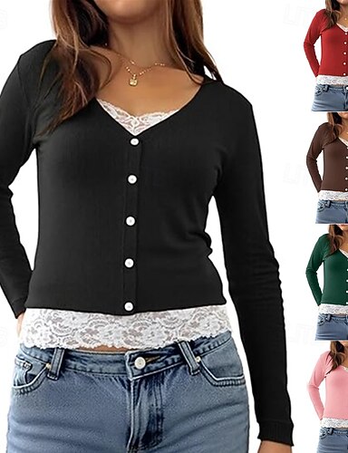 Dames Blouse Kant Lapwerk Knop Effen Kleur Elegant Stijlvol Casual Lange mouw V-hals Normale tops Dagelijks Zwart Blozend Roze Rood Bruin Groen Lente Herfst Winter