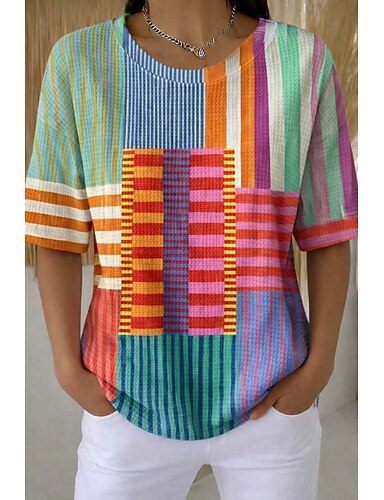 Dames Wafel Gestructureerde Brei Tops T Shirt Kleurblok Ombre Grafisch Geometrie Stijlvol Klassiek Korte Mouw Crew Neck Rond Hals Reguliere Tops Dagelijkse Sport Licht Groen Khaki Regenboog Zomer