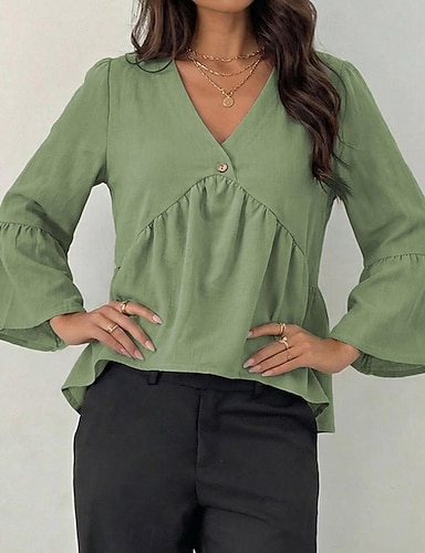 Dames Katoenen linnen overhemd T-shirt Ruche Knop Plooien Effen Kleur Vintage Stijlvol Casual 3/4 mouw klok Mouwen V-hals Normale tops Dagelijks Uitgaan Groen Zomer Lente Herfst