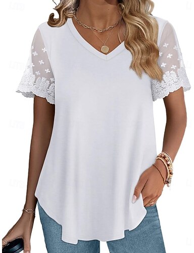 Dames T-shirt Kant splitsende top Effen Kleur Modieus Klassiek Casual Korte mouw V-hals Normale tops Dagelijks Uitgaan Weekend blauw Wit Zomer Lente