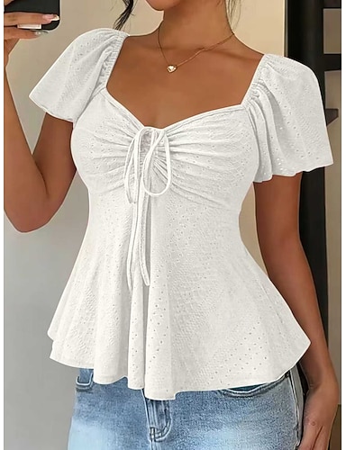 Dames Blouse Trekkoord Vetergat Effen Kleur Stijlvol Sexy Casual Korte mouw Vierkante hals Normale tops Dagelijks Zwart Wit Geel Blozend Roze Hemelsblauw Zomer Lente