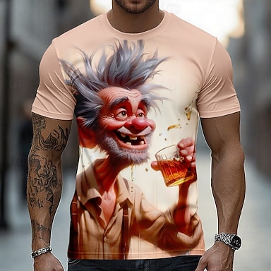 Grappige karikatuur van een oude man met whisky, T-shirt voor heren, 3D cartoon van een gekke dronken opa, korte mouwen, ronde hals, casual T-shirt, cadeau voor drankliefhebbers, designer kleding,