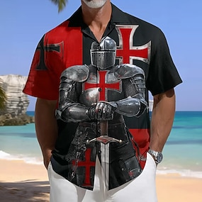 Voor heren Kruisvaarders Schild Kruis Overhemd Cubaans overhemd Overhemd met knopen Korte mouw Vintage Retro Streetwear Feestdagen Zomer Lente Overhemd met kampkraag 3D-afdrukken Zwart