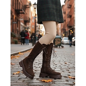 donkerbruine veterlaarzen voor dames tot aan de knie – laarzen met dikke zool in combatstijl voor mode-outfits, wandelen in de buitenlucht, reizen en dagelijks gebruik