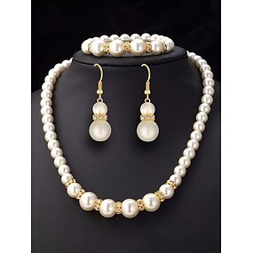 Dames sieradenset met imitatieparels, elegant in goud- en zilverkleur, bestaande uit een halsketting, oorbellen en een armband, perfect voor bruiloften en formele gelegenheden.