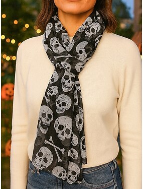 Halloween-sjaal met schedelprint voor dames – lichtgewicht sjaal in gotische stijl voor kostuumfeesten, cosplay en herfstoutfits