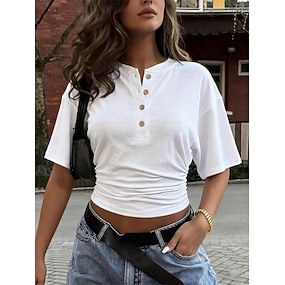Dames T-shirt Henley-shirt T-shirts Met ruches Knop Effen Modieus Korte mouw Henley Croptops Casual Strand Zwart Wit Blozend Roze Wijn Grijs Zomer
