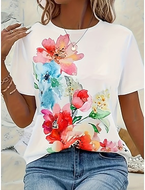 Dames T-shirt Afdrukken Bloemig Stijlvol Klassiek Casual Korte mouw Strakke ronde hals Ronde hals Normale tops Dagelijks Zwart En Rood Groen En Blauw Blauw Zwart Zomer Lente