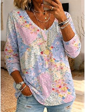 Dames T-shirt Afdrukken Bloemig Grafisch Kleurenblok Vintage Stijlvol Klassiek Lange mouw V-hals Normale tops Dagelijks Blozend Roze Lente Herfst Winter
