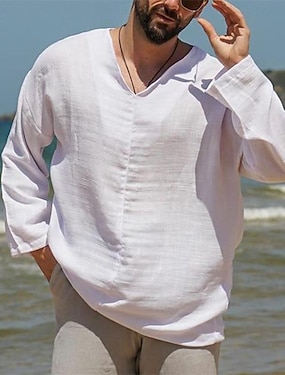 Voor heren Overhemd Linnen overhemd Wit katoenen overhemd Zomer overhemd Strand hemd Katoenen linnen overhemd Effen Vakantie Feestdagen Zwart Wit Khaki Lange mouw V-hals Lente & Herfst Kleding