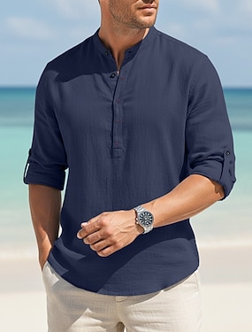 Voor heren Overhemd Linnen overhemd Zomer overhemd Strand Kleding Overhemd met bandkraag Overhemd met opa-kraag Effen Casual Vakantie blauw Zwart Wit Khaki Lange mouw Mandarijn Kraag Zomer Lente