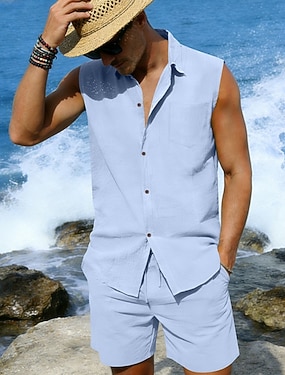 Voor heren Linnen overhemd 2-delig Overhemdset En Korte broek Linnen korte broek Strandshorts Set Effen Casual Dagelijks Buiten Strijkijzer Mouwloos Zomer Modieus Casual Comfortabel Kleding