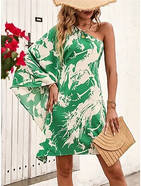 Dames Mini-jurk Zonnejurk Stijlvol Casual Vleermuismouw Vakantie Normale pasvorm Abstract Lange mouw Eén-schouder blauw Groen Zomer