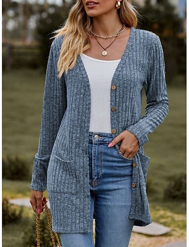 Dames Trui Vest Streetwear Casual Effen Kleur V-hals Knop Gebreid Lange mouw Normale tops breien Dagelijks Feestdagen Uitgaan Licht Blauw Herfst Winter