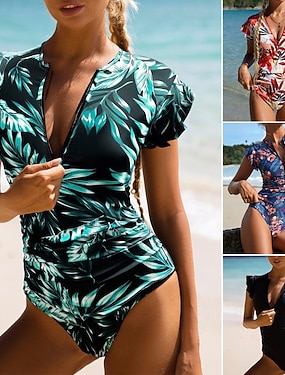 Dames Zwemkleding Een stukje Zwempak Rits omhoog Lapwerk Vakantie Strand Kleding Bloemig Hoge nek Korte Mouw Badpakken