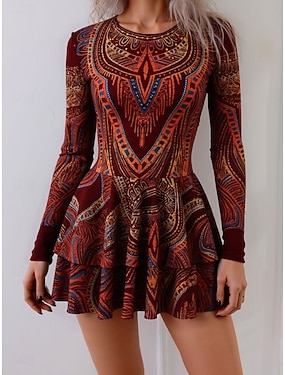 Dames Eénstuk Badpak met Rok Boho Jurk Buikcontrole Hoge Taille Slank Rugloos Vakantie Strandkleding Grafisch Geometrisch Ronde Hals Mouwloos Lange Mouw Badpakken