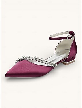 Elegante satijnen bruidspumps voor dames met strassdetails – spitse neus, lage hak, enkelbandje, verkrijgbaar in diverse kleuren.