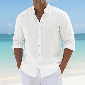Voor heren Linnen overhemd Popover-shirt Normaal shirt Overhemd met bandkraag Effen Vakantie Curise Zwart Wit Blozend Roze Marineblauw Lange mouw Kraag Lente zomer Kleding