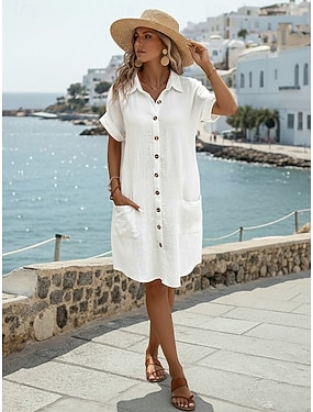 Dames Knielengte jurk Imitatie katoenlinnen Modieus Modern Dagelijks Buiten Vakantie Ruim Passend Effen Korte mouw Overhemdkraag Zwart Wit Geel Groen Zomer Lente