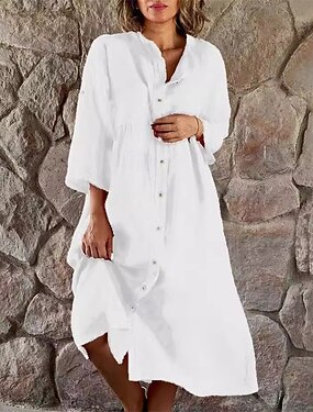 Dames Halflange jurk Imitatie katoenlinnen Hemdjurk Kaftanjurk Casual jurk Modieus Buiten Feest Feestdagen Normale pasvorm Effen 3/4 mouw V-hals Wit Geel Grijs Zomer