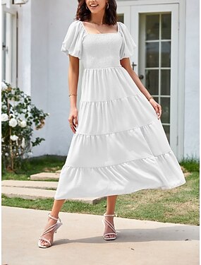 Dames Halflange jurk Casual jurk A lijn jurk Elegant Modieus Modern Pofmouw Buiten Vakantie Uitgaan Normale pasvorm Effen Korte mouw Vierkante hals Zwart Wit Blozend Roze Leger Groen Zomer Lente