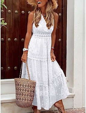 Dames Halflange jurk Kanten jurk Witte jurk Zomerjurk Elegant Modieus Strand Vakantie Feestdagen Normale pasvorm Effen Mouwloos V-hals Wit Zomer Lente