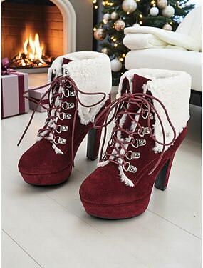 Rode laarzen met imitatiebontvoering en hoge hak voor dames – stijlvolle veterlaarzen met plateauzool voor de winter, kerstfeestjes en feestelijke gelegenheden