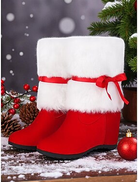 Rode, met bont gevoerde laarzen met sleehak voor dames met strik - comfortabele winterlaarzen voor feestdagen, Kerstmis, casual uitjes en koud weer