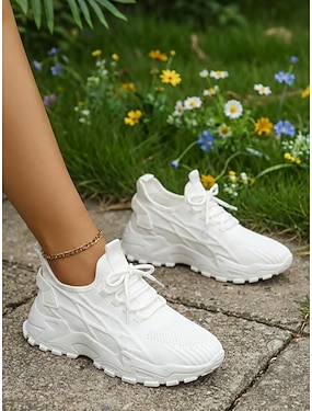 Witte gebreide instapsneakers voor dames met een dikke zool en een elastische pasvorm. Comfortabele casual schoenen voor dagelijks gebruik, wandelen, reizen, winkelen en buitenactiviteiten.