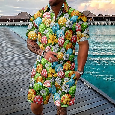 Pasen Voor heren Ei 2 stuks Overhemden Sets Overhemdset Korte mouw Korte broek Strijkijzer Casual Casual Dagelijks Festivaloutfit 3D-afdrukken Zomer paars