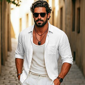 Voor heren Overhemd Linnen overhemd Wit katoenen overhemd Zomer overhemd Strand hemd Katoenen linnen overhemd Effen Vakantie Feestdagen Zwart Wit Khaki Lange mouw V-hals Lente & Herfst Kleding