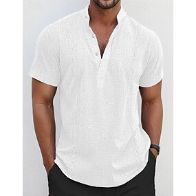 Voor heren Overhemd Linnen overhemd Popover-shirt Zomer overhemd Strand Kleding Overhemd met bandkraag Effen Vakantie Casual Zwart Wit Geel Blozend Roze Korte mouw Henley Zomer Kleding