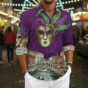 Mardi gras Voor heren Carnaval kralen Masker met veren Overhemd Overhemd met knopen Lange mouw Mode-casual Feest Feestdagen Lente Herfst Strijkijzer 3D-afdrukken shirts met kraag blauw Paars Groen