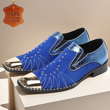 Elegante blauwe leren herenschoenen met borduursels, stijlvolle formele loafers voor bruiloften, luxe schoeisel voor de bruidegom en bruiloftsgasten