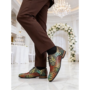 Kleurrijke leren herenschoenen voor bruiloften - veelkleurige krokodillenprint, unieke en opvallende schoenen voor bruiloften en formele gelegenheden.
