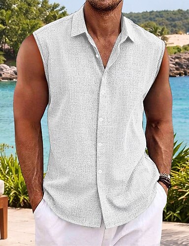 Voor heren Overhemd Linnen overhemd Popover-shirt Zomer overhemd Strand Kleding Mouwloos shirt Effen Kleur Vakantie Straat Zwart Wit Marineblauw Hemelsblauw Mouwloos Overhemdkraag Zomer Lente Kleding