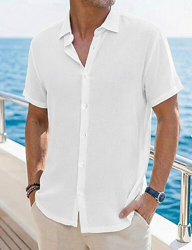Voor heren Overhemd Linnen overhemd Overhemd met knopen Effen Kleur Vakantie Straat Zwart Wit Geel Lichtgroen Korte mouw Overhemdkraag Zomer Lente Kleding Knop