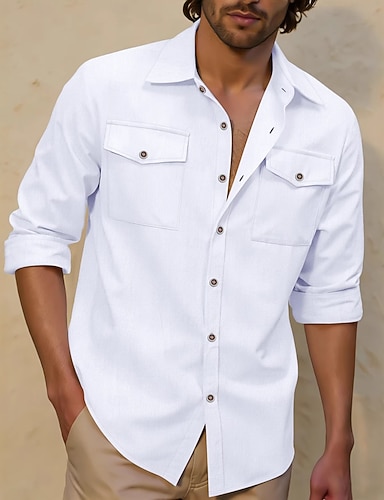 Voor heren Overhemd Linnen overhemd Guayabera-shirt Zomer overhemd Strand hemd Overhemd met knopen Effen Vakantie Casual Wit Lange mouw Kamp kraag Zomer Lente Kleding Zak