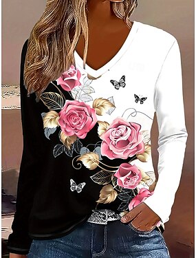 Dames T-shirt Afdrukken Bloemig Grafisch Kleurenblok Vintage Stijlvol Klassiek Lange mouw V-hals Normale tops Dagelijks Blozend Roze Lente Herfst Winter