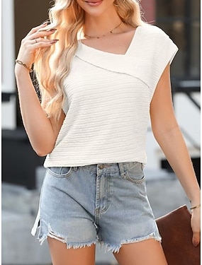 Dames T-shirt Effen Modieus Stijlvol Klassiek Korte mouw Asymmetrische nek Normale tops Dagelijks Uitgaan Weekend Zwart Wit Blozend Roze Abrikoos Zomer Lente