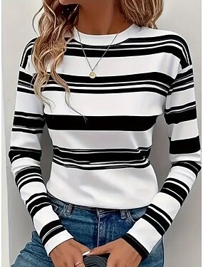 Dames T-shirt Lange Mouwen Crew Neck Lange Mouwen Tuniek Graphic Geometrisch Gestreept Vintage Stylish Ronde Hals Reguliere Tops Dagelijkse Print Zwart Wit Roze Blauw Bruin Herfst Voorspeel