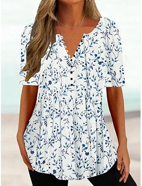 Dames T-shirt Henley-shirt Knop Afdrukken Bloemig Tuniekjes Basic Korte mouw Ronde hals Normale tops Feestdagen Weekend blauw Wit Geel Lichtgroen Groen
