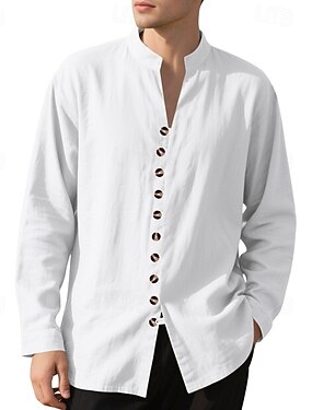 Voor heren Overhemd Linnen overhemd Viking-stijl Zomer overhemd Strand Kleding Overhemd met bandkraag Effen Kleur Casual Vakantie Zwart Wit Groen Khaki Lange mouw Overhemdkraag Zomer Lente Kleding