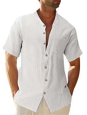 Voor heren Linnen overhemd Popover-shirt Zomer overhemd Strand Kleding Normaal shirt Overhemd met bandkraag Effen Casual Dagelijks Zwart Wit Blozend Roze Wijn Korte mouw V-hals Zomer Kleding