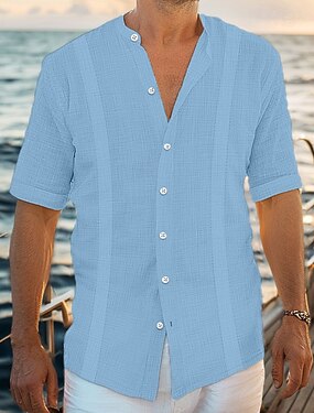 Voor heren Overhemd linnen overhemd Guayabera-shirt Overhemd met bandkraag Zomer overhemd Strand Kleding Effen Vakantie Curise Zwart Wit blauw Groen Korte mouw Kraag Zomer Kleding