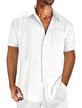 Voor heren Overhemd linnen overhemd Katoenen linnen overhemd Guayabera-shirt Zomer overhemd Strand hemd Effen Vakantie Casual Zwart Wit Marineblauw Blauw Korte mouw Revers Zomer Kleding Voorvak