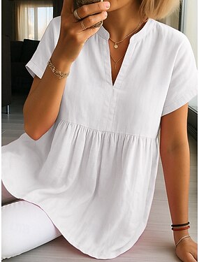 Dames Blouse 100% Katoen Met ruches Effen Basic Korte mouw Kap V-hals Normale tops Dagelijks Werk blauw Wit Geel Blozend Roze Zomer Lente Herfst