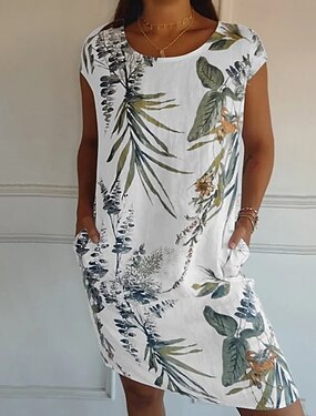 Dames Halflange jurk Imitatie katoenlinnen Hemdjurk Casual jurk Katoenen jurk Basic Casual Dagelijks Vakantie Normale pasvorm Bloemig Korte mouw Strakke ronde hals blauw Wit Groen Grijs Zomer