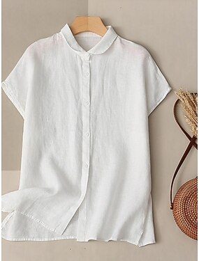 Dames Blouse Katoenen shirt Imitatie katoenlinnen Vetergat Effen Kleur Dagelijks Stijlvol Basic Korte mouw Opstaand Normale tops Dagelijks Wit Zomer Lente
