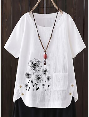 Dames Grote maten Katoenen linnen overhemden T-shirt Imitatie katoenlinnen Afdrukken Bloem Dagelijks Korte mouw Strakke ronde hals Normale tops Dagelijks Wit Geel Blozend Roze Lente Alle seizoenen